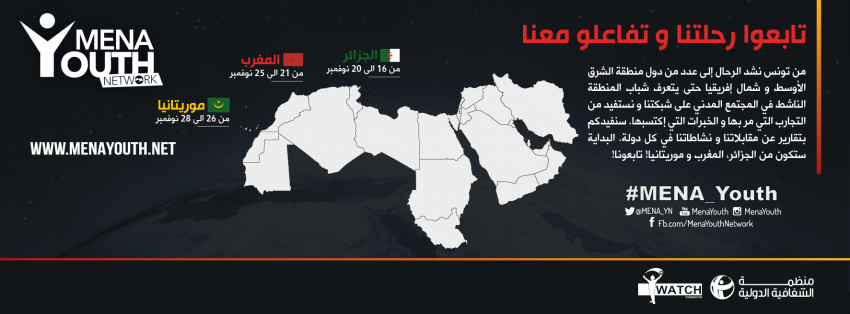 من تونس نشد الرحال إلى عدد من دول منطقة الشرق الأوسط و شمال إفريقيا حتى يتعرف شباب المنطقة الناشط في المجتمع المدني على شبكتنا و نستفيد من التجارب التي مر بها و الخبرات التي اكتسبها. سنفيدكم بتقارير عن مقابلاتنا و نشاطاتنا في كل دولة. البداية ستكون من الجزائر، المغرب و موريتانيا! تابعونا