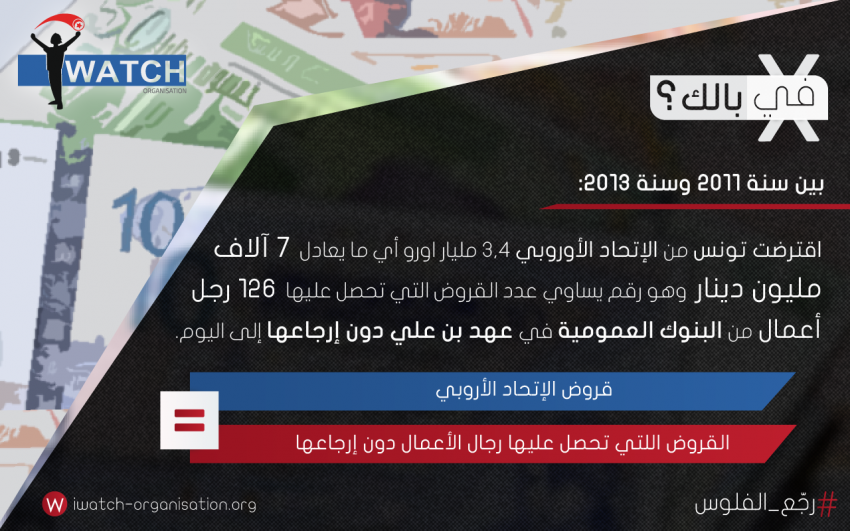 في بالك؟بين سنة 2011 وسنة 2013: اقترضت تونس من الإتحاد الأوروبي 3.4 مليار اورو أي ما يعادل 7 آلاف مليون دينار وهو رقم يساوي عدد القروض التي تحصل عليها 126 رجل أعمال من البنوك العمومية في عهد بن علي دو...