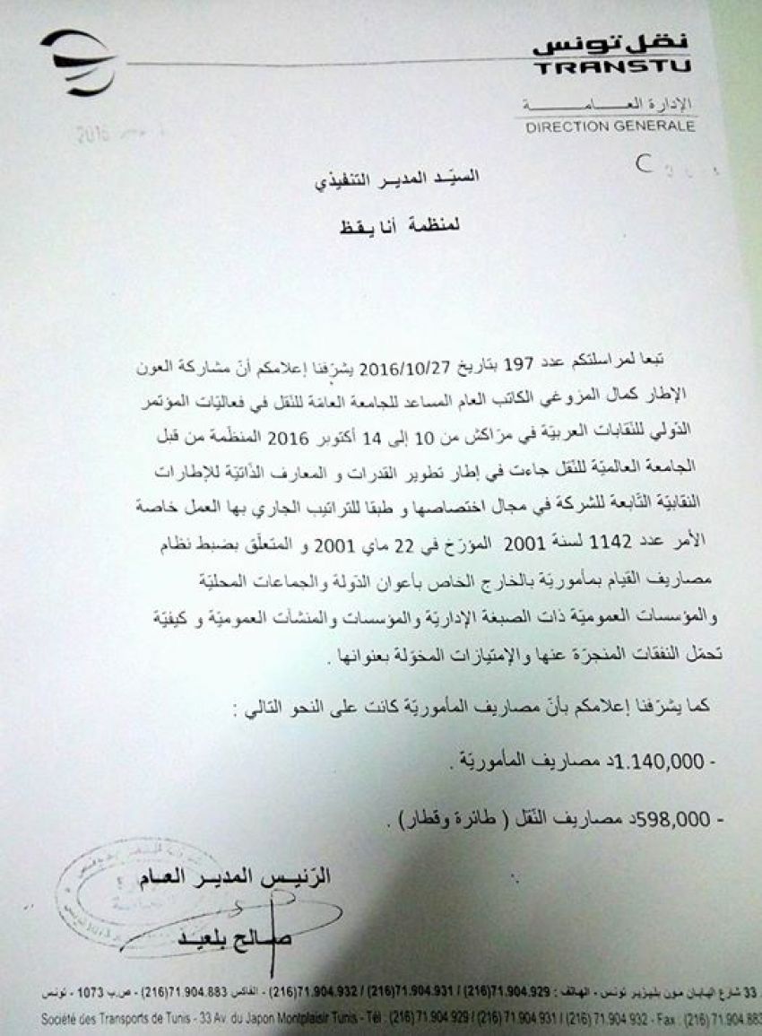 وبرّرت الشركة تكفّلها بنفقات سفرة نقابية بحتة ولا علاقة لها بالشأن الإداري بـ "تطوير القدرات والمعارف الذاتية للإطارات النقابية التابعة للشركة في مجال اختصاصها". وقد سبق هذه السفرة النقابية الى الخارج وعلى حساب ميزانية الشركة التي تعاني من عجز مالي متفاقم منذ سنوات، مراسلة من الكاتب العام للجامعة العامة للنقل المنصف بن رمضان الى الرئيس المدير العام لنقل تونس صالح بلعيد بتاريخ 28 سبتمبر 2016 قصد "تمكين الأخ كمال المزوغي الكاتب العام المساعد للجامعة العامة للنقل من المشاركة في فعاليات المؤتمر الدولي للنقابات العربية وعلى حساب المؤسسة الموقرة ".