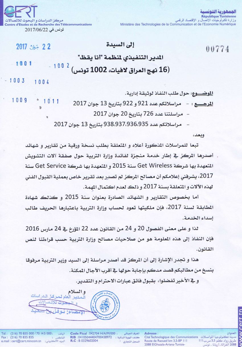 من جهة اخرى اعتذر المركز عن تمكين أنا يقظ من شهادة المطابقة وتقارير الاختبار والشهائد التي سبق لها ان اصدرها بخصوص آلات التشويش التي وفرتها شركة GET WIRELESS سنة 2015، مشيرا الى اصداره مراسلة الى وزارة التربية لمد المنظمة باجابة عن طلب النفاذ الى المعلومة الذي تقدمت به أنا يقظ.