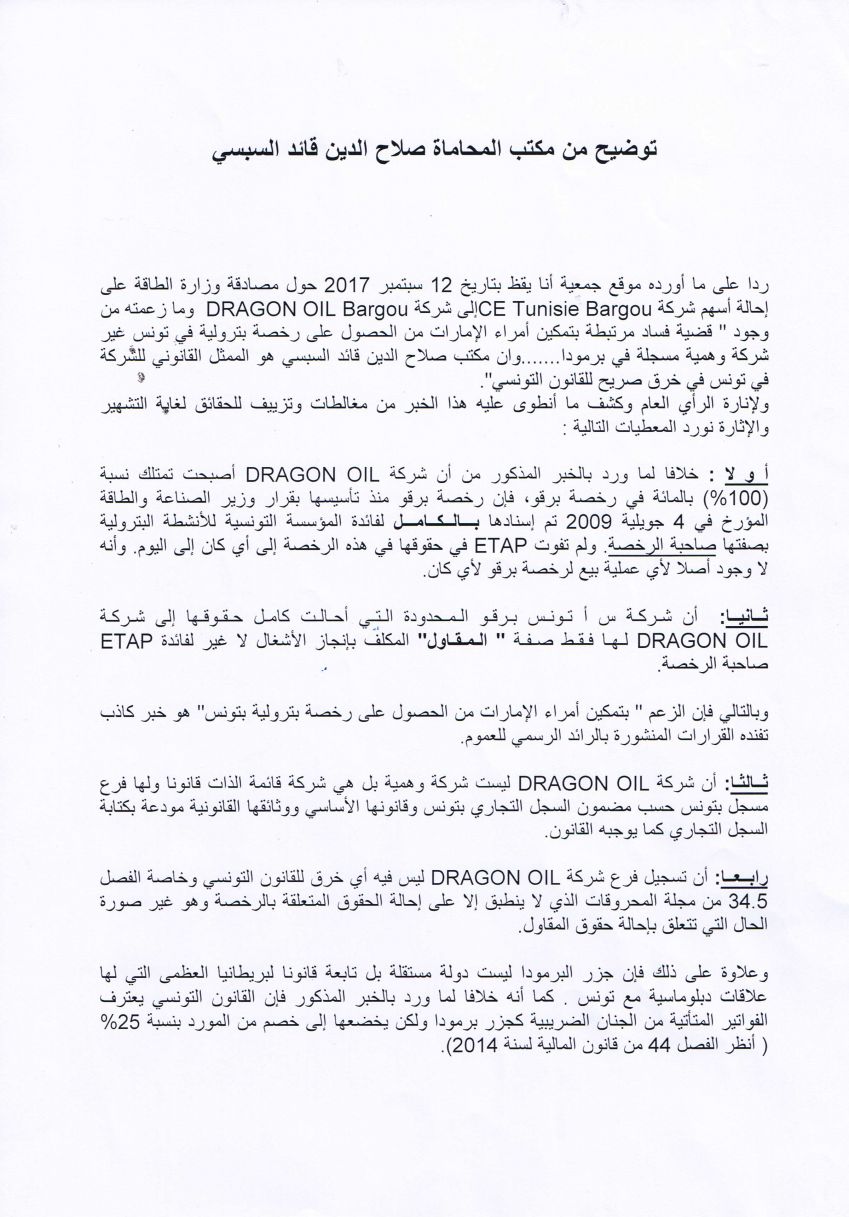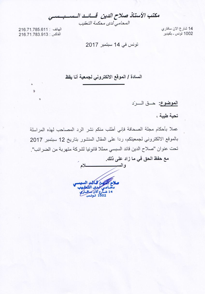 بعد صدور تحقيقنا بتاريخ 12 سبتمبر 2017 تحت عنوان ''صلاح الدين قائد السبسي ممثلا قانونيا لشركة متهربة من الضرائب؟'' وردت علينا يوم أمس الخميس 14 سبتمبر 2017 المراسلة التالية من مكتب الأستاذ صلاح الدين قائد السبسي والتي ننشرها في إطار حق الرد: