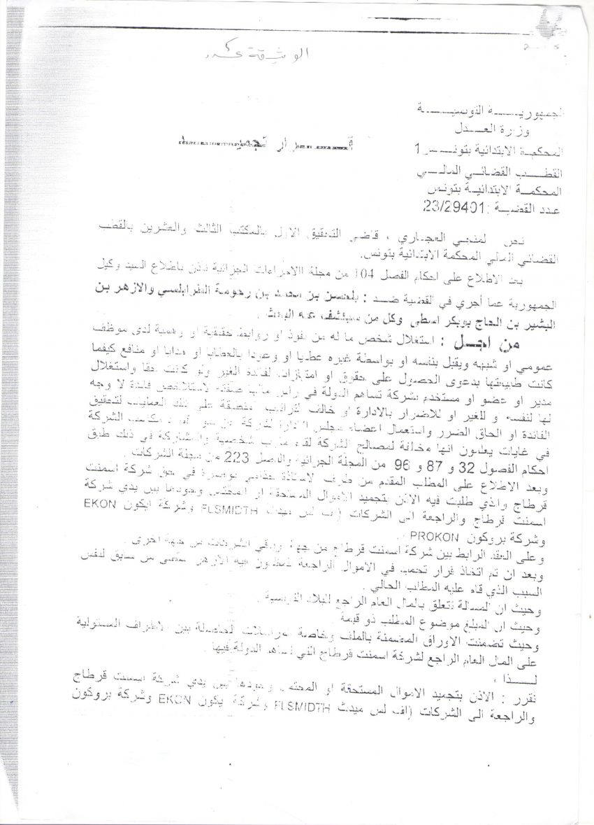 كما تمّ الوقوف على مراسلات تحت عنوان ''سرية'' صادرة عن عصام فريدريك السعدي بصفته وسيطا تجاريا موجهة لكلّ من SUINAT HUBERT عن شركة FLS وHozkan عن شركة PROKON بتاريخ 11 اكتوبر 2011 يعلمهما ''بمنع لزهر اسطى من السفر وبشكوكه حول تتبع حساباته البنكية في الخارج من قبل الدولة التونسية وانّ اية مبالغ او دفوعات قد تحجز''، طالبا منهم ''عدم تحويل المبالغ المتفق عليها والتريث الى حين ايجاد حل لهذه الوضعية''. كما تضمّنت المراسلة خوف الوسيط من امكانية مطالبة شركة اسمنت قرطاج باسترجاع هاته المبالغ.