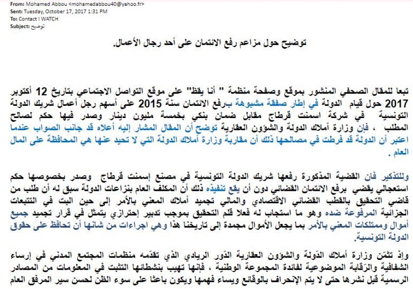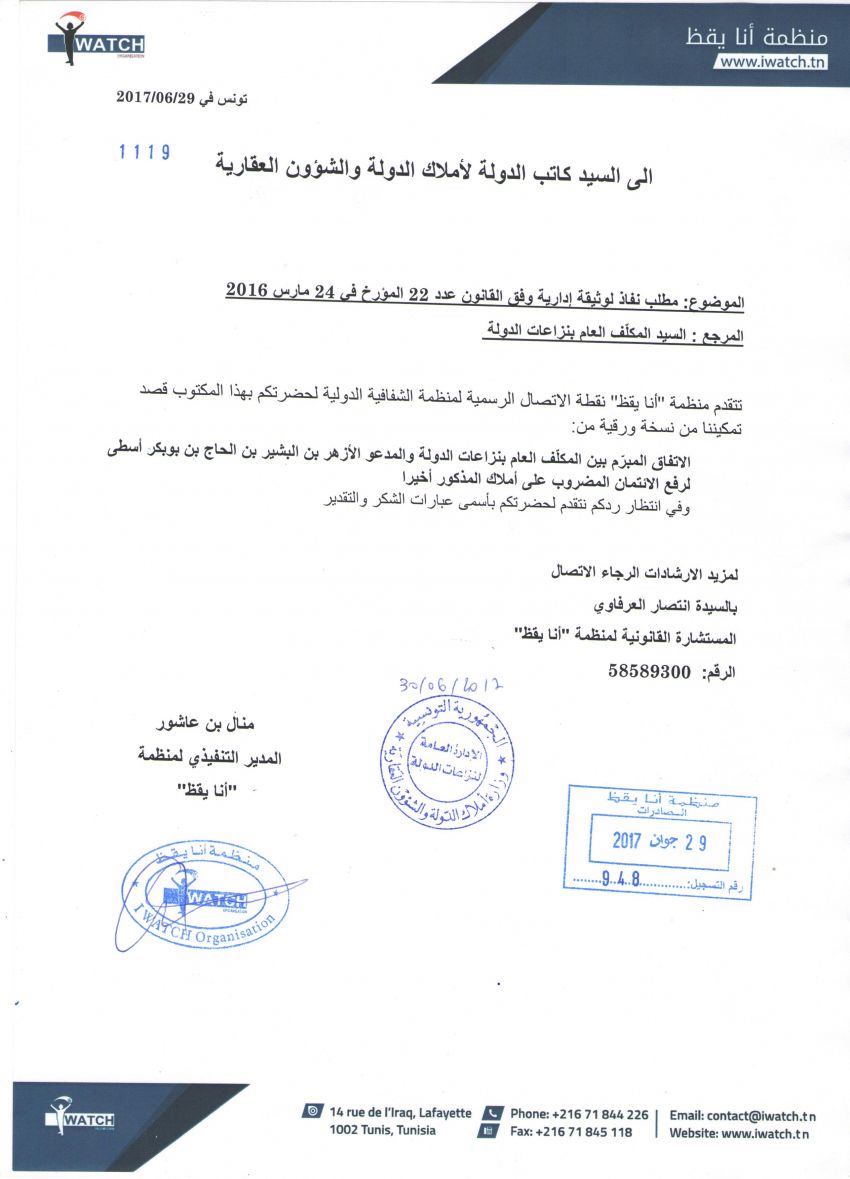 كما التمست وزارة أملاك الدولة من أنا يقظ التثبت من المعلومات من المصادر الرسمية قبل نشرها، متغافلة عن مطلب النفاذ الذي ورد عليها من المنظمة بتاريخ 30 جوان 2017، ليبقى دون إجابة من الوزارة.
