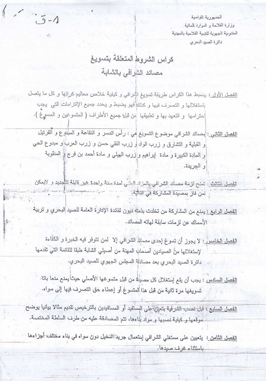 هذا وينص كراس الشروط المتعلق بتسويغ مصائد الشرافي بالشابة في فصله الثامن على ''استعمال جريد النخيل دون سواه في بناء مختلف أجزاء الشرافي باستثناء غرف صيدها''