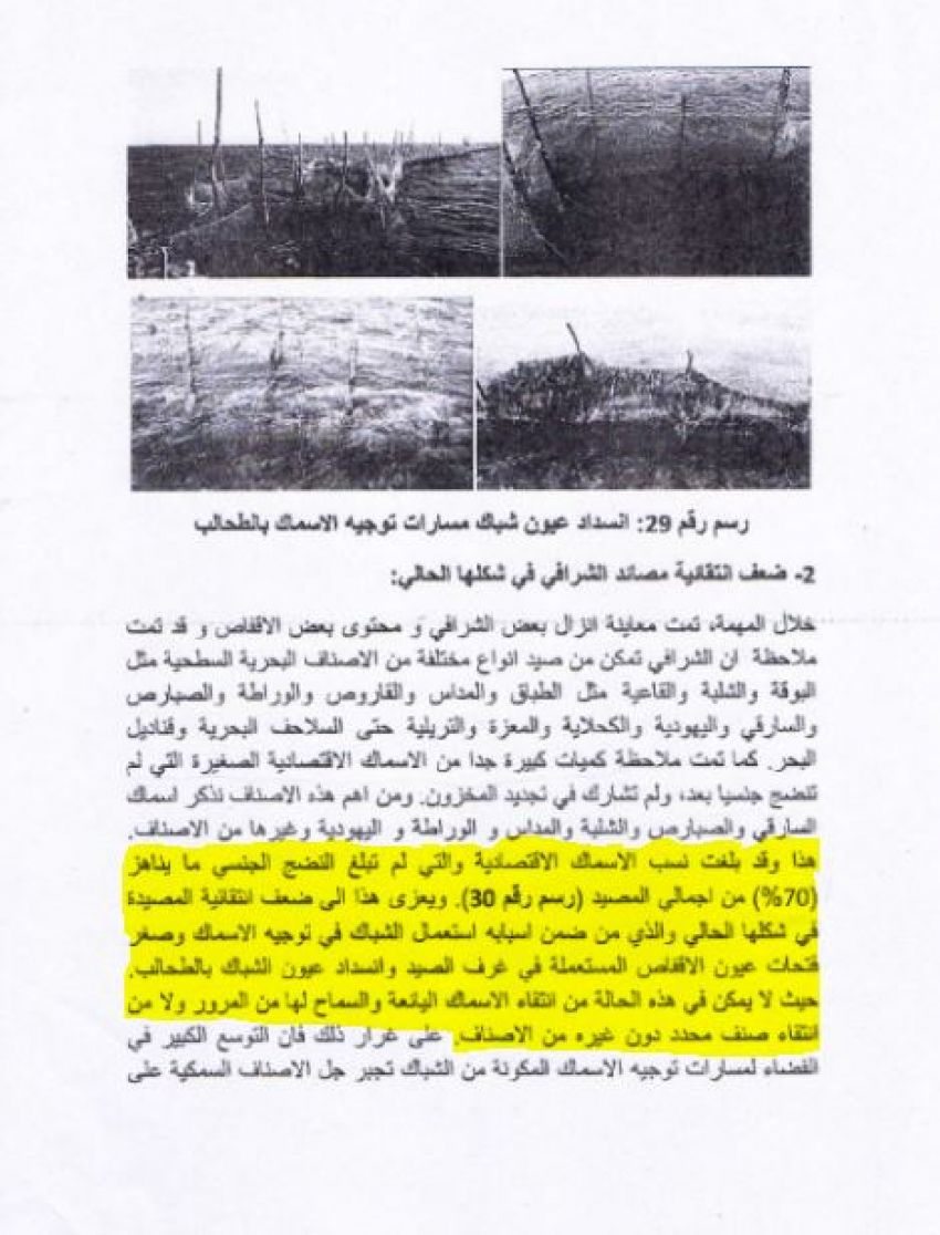 وتعزى هذه الحصيلة المعيقة لتجدد المخزون السمكي، وفق تقرير المعهد، الى ضعف انتقائية ادوات الصيد، من خلال التعويل على الشِباك البلاستيكية التي سرعان ما تنسدّ عيونها الصغيرة بالطحالب. ولا يمكن في هذه الحالة استثناء الأسماك الصغيرة.