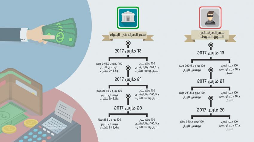 وهنا لا بدّ أن نذكر بأننا اضطررنا إلى دفع 257 دينارا لشراء 100 دولار في مرة أولى وارتفع السعر في اليوم الثاني إلى 260 دينار، في الوقت الذي كان سعر شراء المائة دولار في البنك في حدود 243 دينار. ولكن يمنع البنك من تسليم العملات الأجنبية ما يجعل من السوق السوداء المصدر الوحيد لها.