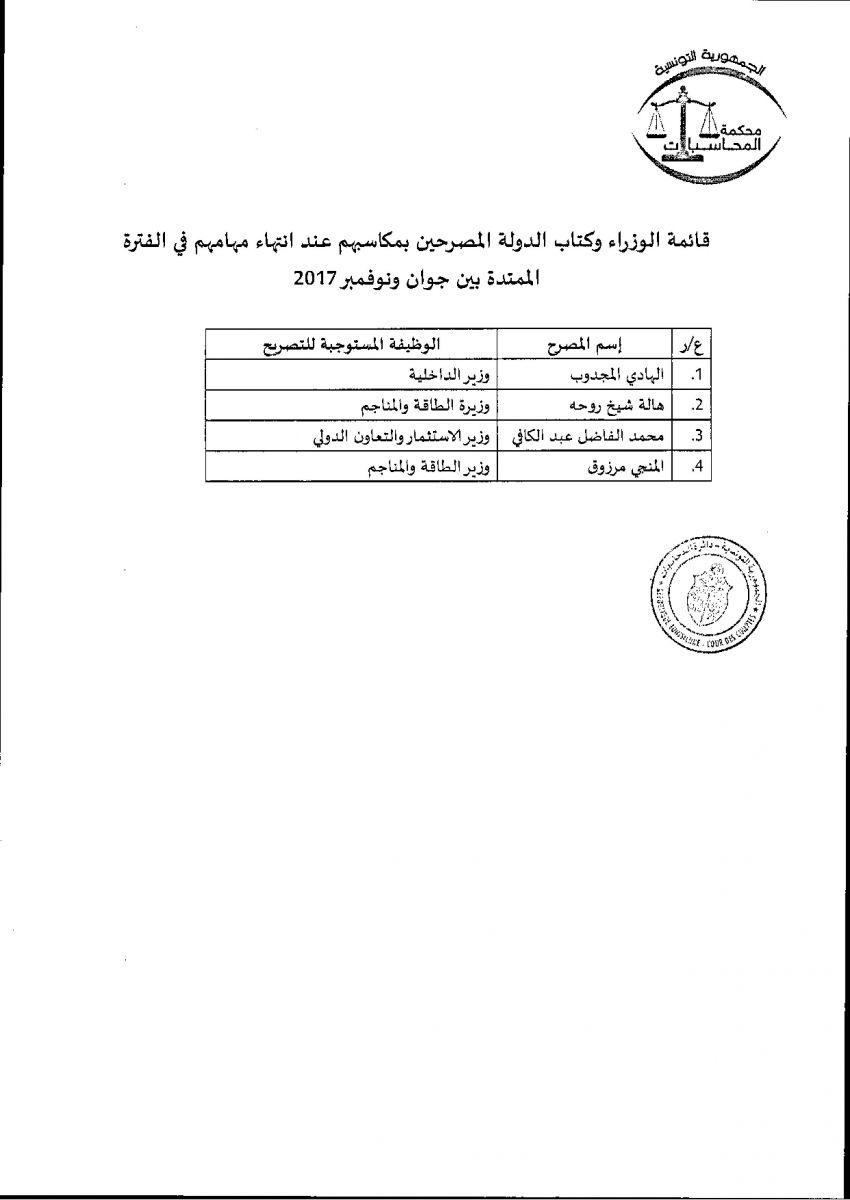 وبالرجوع إلى دائرة المحاسبات وفق القانون المتعلّق بحقّ النفاذ الى المعلومة تبيّن أن مجموعة من الوزراء تخلّفوا عن التصريح بعد مرور شهر - وفق ما يضبطه القانون - من انتهاء مهامهم وهم الآتي ذكرهم
