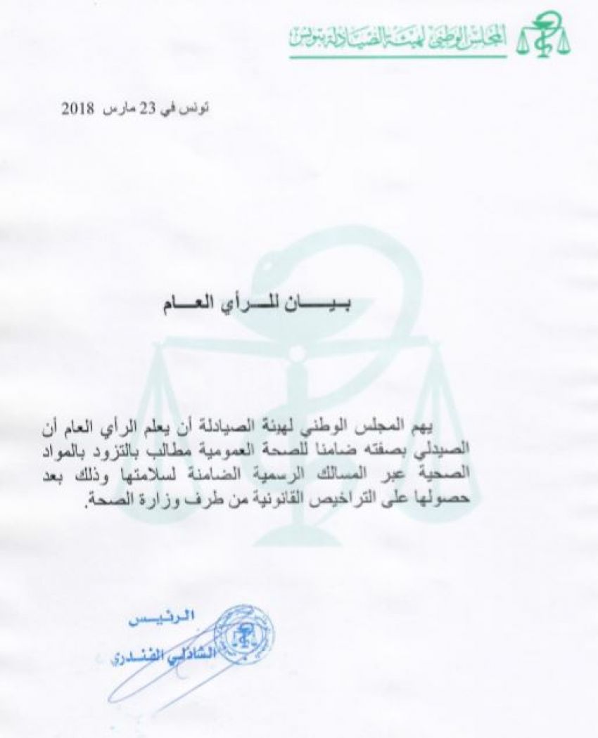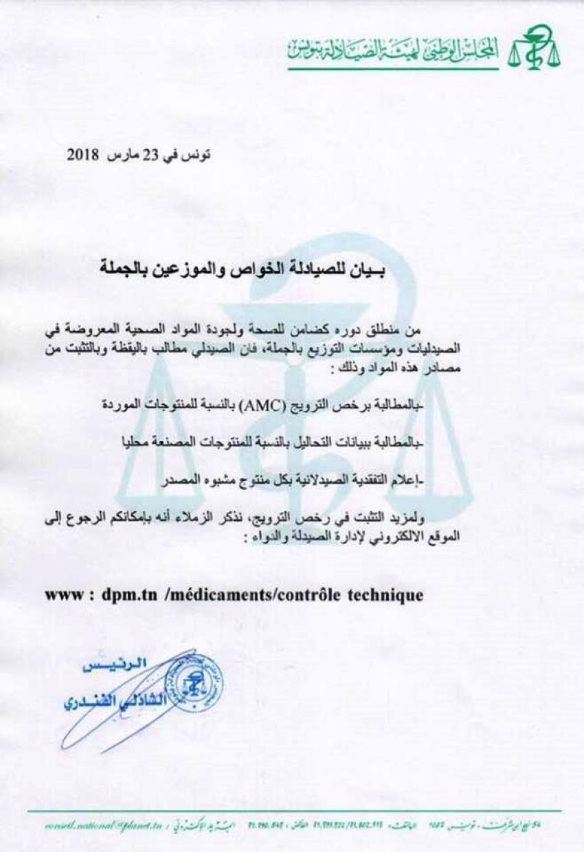 في هذا السياق شدّد البيان الموقّع من قبل رئيس هيئة الصيادلة الشاذلي الفندري على أن يطالب كل صيدلي قبل اقتناء هذه المواد الصحية بتوفر رخص الترويج المعروفة بـ AMC بالنسبة للمنتجات المورّدة، ويطلع على نتائج التحاليل بالنسبة للمنتجات المصنعة محليا مع اعلام التفقدية الصيدلانية عند التفطن لأي منتج مشبوه.