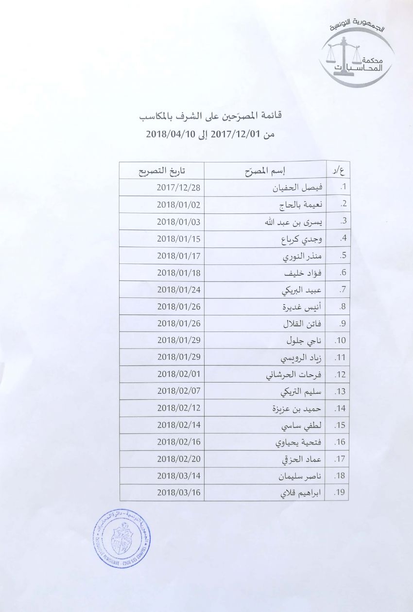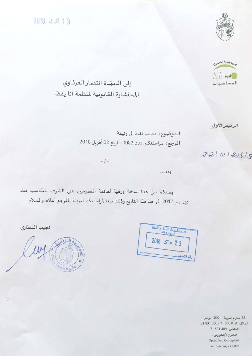 في متابعة منها لمدى احترام الوزراء للقانون عدد 17 لسنة 1987 المتعلّق بالتصريح على الشرف بمكاسب أعضاء الحكومة وبعض الأصناف من الاعوان العموميين، وتزامنا مع مواصلة مجلس نواب الشعب النظر في مشروع القانون المتعلق بالتصريح بالمكاسب والمصالح وبمكافحة الثراء غير المشروع وتضارب المصالح بالقطاع العام، تحصّلت منظمة أنا يقظ من دائرة المحاسبات على نسخة من قائمة الوزراء المصرّحين بالمكاسب الفترة الممتدة بين جانفي وافريل 2018.