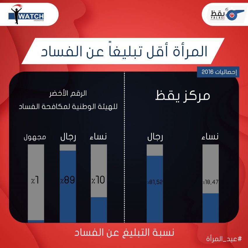 رغم الدور الايجابي الذي تلعبه المرأة في عدم الانخراط في منظومة الفساد إلاّ أنّها أقلّ انخراطا في منظومة التبليغ عن الفساد حيث بيّنت الاحصائيات الراجعة إلى مركز يقظ لدعم وإرشاد ضحايا الفساد التابع لمنظمة أنا يقظ أنّ نسبة تبليغ المرأة عن الفساد تعرف ضعفا كبيرا مقارنة بالرجال، حيث لم تتجاوز 10% سنة 2015 وهي نسبة مماثلة لسنة 2016 و2017 حيث سجّل المركز تبليغ 75 امرأة عن الفساد مقابل 331 بلاغا مقدّما من طرف الرجال والامر سيّان بالنبسة للهيئة الوطنية لمكافحة الفساد حيث لم يتجاوز تبليغ المرأة عن الفساد عن طريق الرقم الأخضر 10 % مقابل 89% للرجال [7] وهي مسألة يمكن إرجاعها إلى حداثة القانون المتعلّق بالابلاغ عن الفساد وحماية المبلغين والتي تجعل المرأة أكثر تغاضي عن الفساد خوف من تبعاته على مستقبلها الوظيفي وعلى حياتها الاسرية ،وهي نقطة تختاج متابعة من طرف علماء الاجتماع الدولة والمجتمع المدني