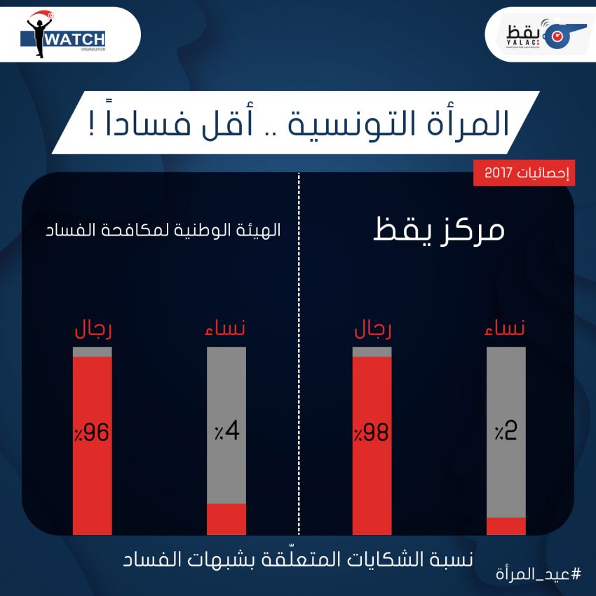 على مستوى التزامها بالشفافية والنزاهة والحوكمة الرشيدة، تفيد الارقام أنّ المرأة التونسية أقلّ فسادا من الرجل وهو ما بيّنته احصائيات مركز يقظ لدعم وإرشاد ضحايا الفساد التابع لمنظمة أنا يقظ التي شدّدت على أن نسبة الشكايات المتعلّقة بشبهات الفساد المقدّمة ضدّ النساء لم تتجاوز %2 سنة [1]2017 ولم تبلغ 1% بالنسبة الى 2018[2] . وهو ما أكدّته احصائيات الهيئة الوطنية لمكافحة الفساد التي لم تتجاوز الشكايات الواردة عليها ضدّ المرأة 4% مقابل 96% منها مقدّمة ضد الرجال[3].