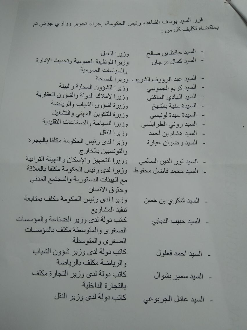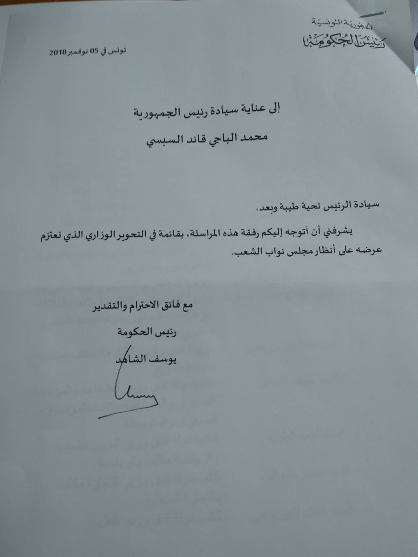 هذه المراسلة التي حصلت عليها منظمة أنا يقظ أمس الجمعة من رئاسة الجمهورية إثر تقدمها بمطلب نفاذ الى المعلومة، على عكس رئاسة الحكومة التي لم تستجب بعد، تكشف إجراء رئيس الحكومة يوسف الشاهد 4 تغييرات أساسية على قائمة التحوير الوزاري التي أحالها على رئيس الجمهورية الباجي قائد السبسي قبل الإعلان عن التحوير ثم الذهاب للبرلمان. تتلخص هذه التغييرات في تبخر إسم حافظ بن صالح الذي ترأس قائمة التحوير كوزير للعدل ليحل محله كريم الجموسي الذي كان مبرمجا كوزير للشؤون المحلية لتؤول حقيبة العدل الى الجموسي ويختفي اسم بن صالح واضافة اسمين جديدين هما مختار الهمامي وزيرا للشؤون المحلية والبيئة وبسمة الجبالي في خطة كاتبة للدولة لدى وزير الشؤون المحلية والبيئة.