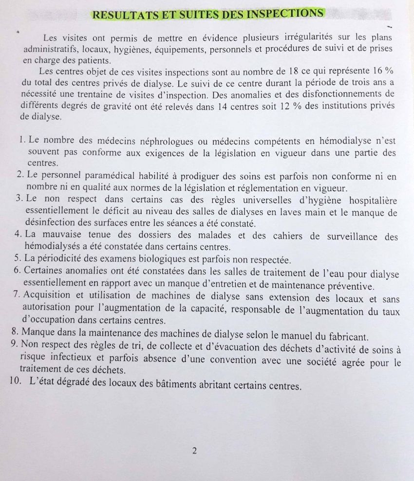♦ إثر إرسالها لمطلب نفاذ الى المعلومة الى وزارة الصحة، بتاريخ 21 جوان 2018 للحصول على تقارير التفقد الخاصة بمراكز تصفية الدم بين 2015 و2017، ورد على أنا يقظ ملخّصا مقتضبا من الوزارة، تضمن تعدادا لبعض التجاوزات الحاصلة في قطاع تصفية الدم بالمراكز الخاصة على غرار: