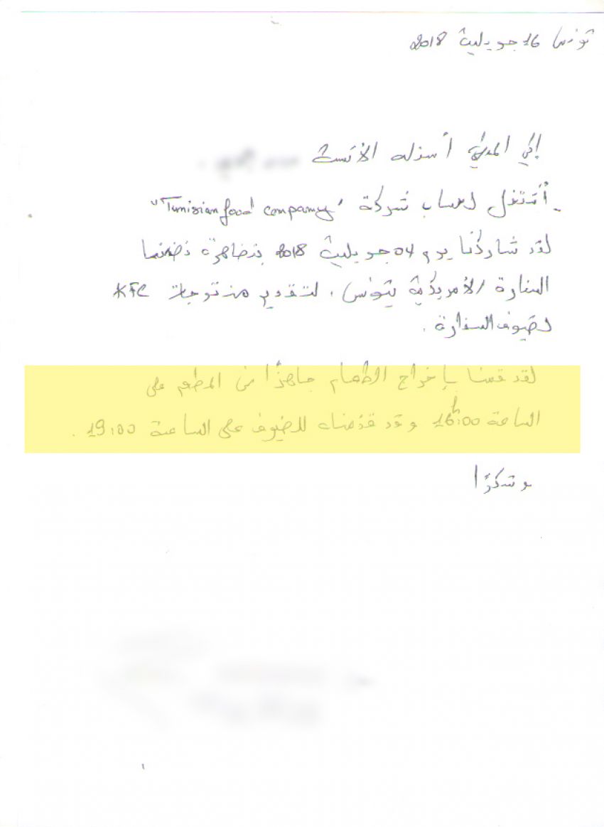 تجدون أدناه مراسلات شركة تونيزيان فوود كومباني و مدير العمليات, كل ما تضمنته المراسلاتان لا تلزمان منظمة أنا يقظ في أي شيء و يتحمل كاتبوا هذه الردود دون سواهم مسؤوليتها القانونية.